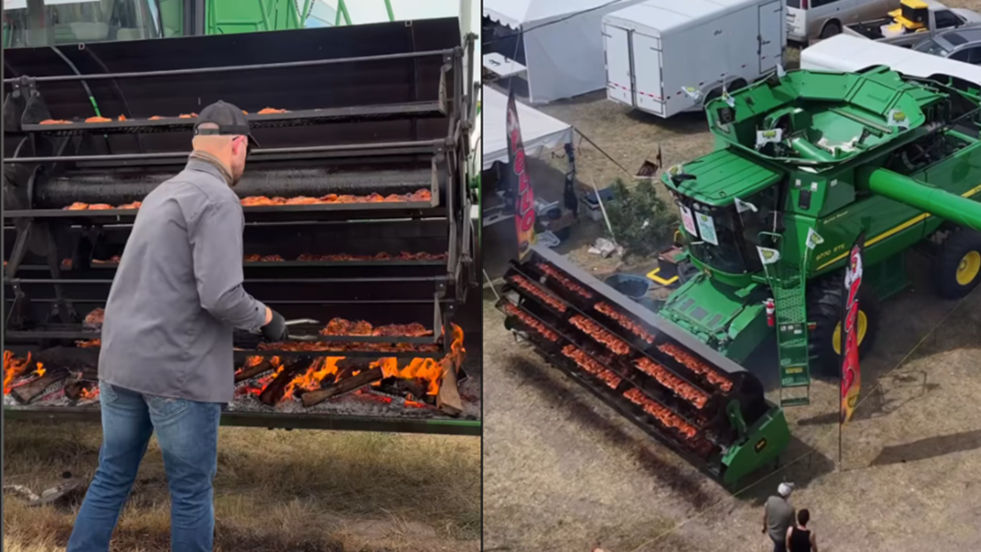El video no solo muestra una innovadora forma de cocinar, sino también una manera de posicionar la cultura rural dentro de las tendencias digitales. La cosechadora, de color verde con detalles amarillos, fue modificada en su parte frontal: se retiraron las cuchillas y se instalaron parrillas para el asado. El fuego, alimentado con leña, aportó ese toque tradicional, mientras al fondo se observan familias disfrutando del evento.