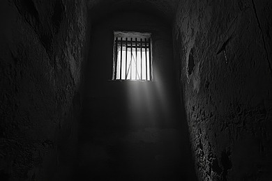 A small window in the dark room, with light coming from outside, black and white photography.