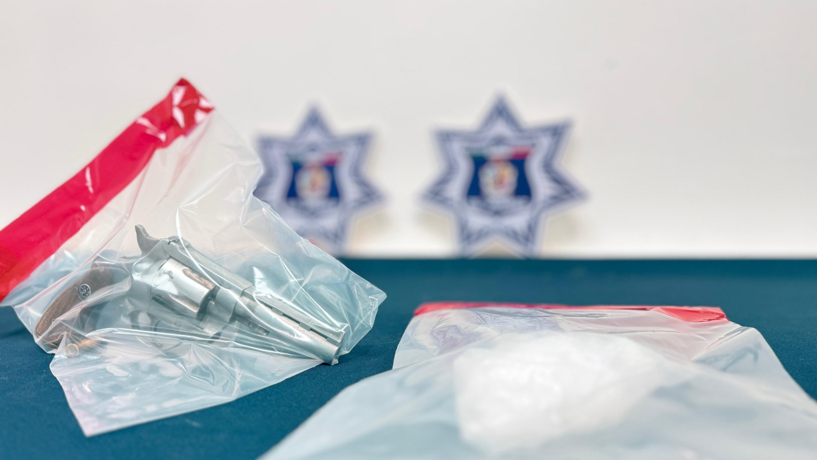 Tras marcarles el alto en el cruce de Manuel N. López y Santiago Blancas, se realizó una inspección al automóvil. En el interior, entre los asientos, se localizó un arma de fuego tipo revólver calibre .38 con un cartucho útil, así como una bolsa con aproximadamente 102 gramos de cristal.