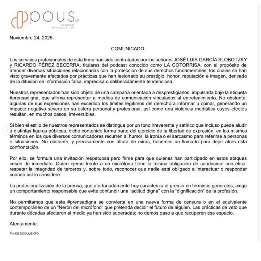 Según el comunicado emitido por la firma, los comediantes contrataron sus servicios con el fin de “proteger sus derechos fundamentales”, asegurando que han sido víctimas de la difusión de contenido falso, impreciso y tendencioso que afecta su reputación, honor e imagen personal y profesional.