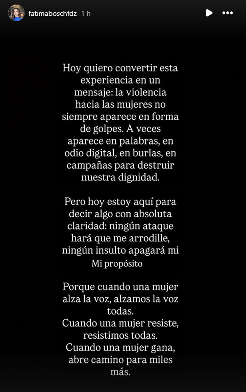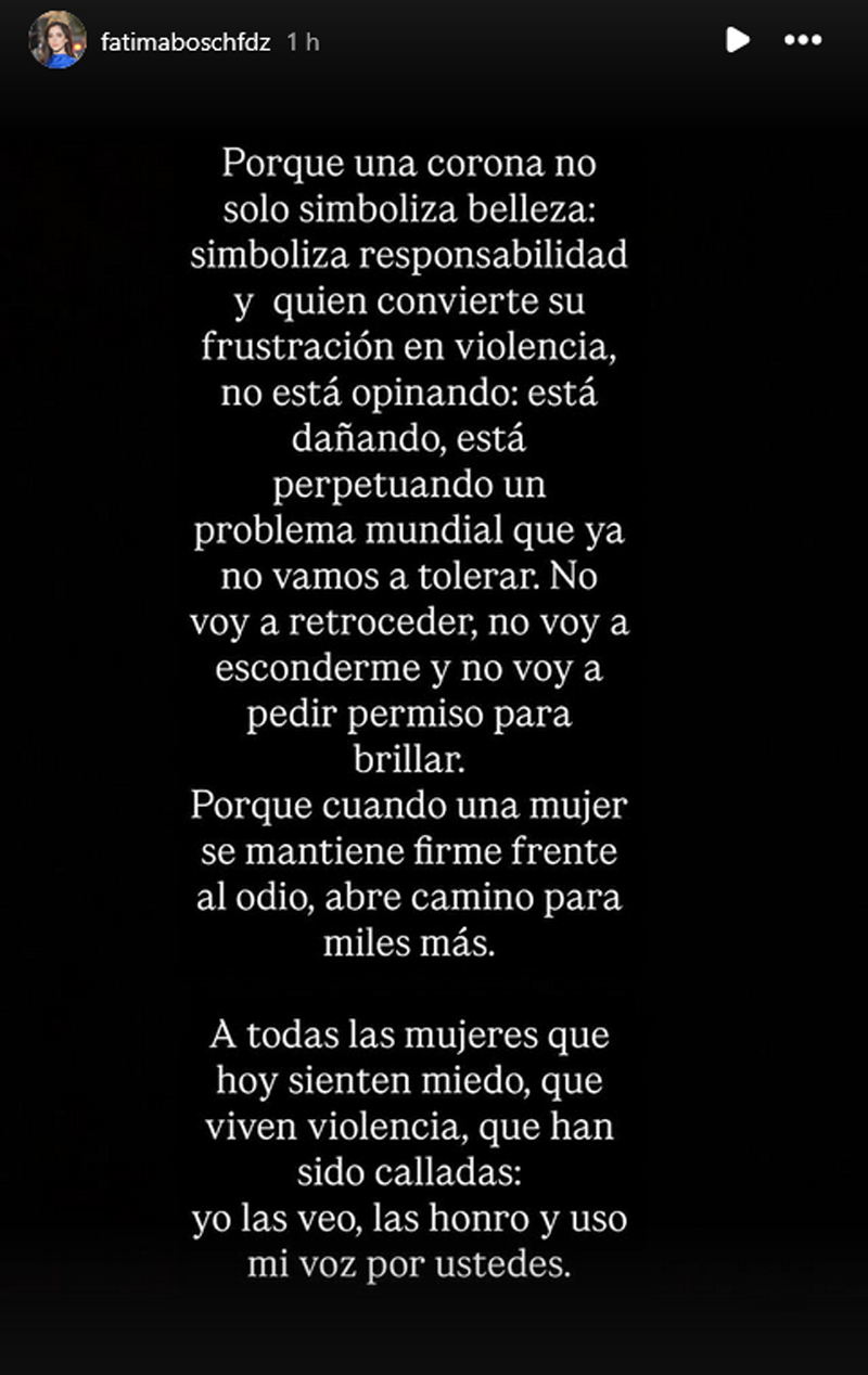 Fátima Bosch se convierte así no solo en una figura de belleza internacional, sino también en una voz activa contra la violencia de género y el odio digital.
