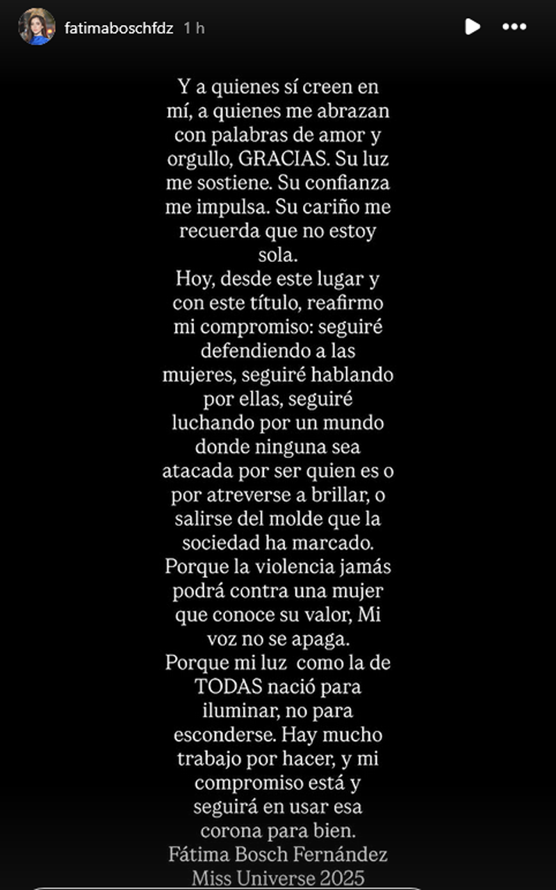 Ciudad de México. Luego de ser coronada como Miss Universo 2025, la mexicana Fátima Bosch Fernández rompió el silencio a través de un poderoso mensaje publicado en sus historias de Instagram, en el que denunció haber sido víctima de insultos, agresiones verbales e incluso amenazas de muerte tras su triunfo en el certamen internacional.
