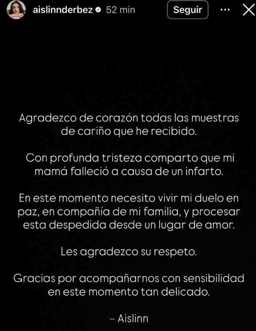 Fue precisamente Aislinn quien, mediante una historia en Instagram, reveló que su madre falleció a causa de un infarto. Al mismo tiempo, pidió respeto y privacidad para su familia en este momento de duelo, señalando:
