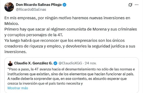 Uno de los mensajes que generó mayor polémica fue su respuesta a un comentario de Claudio X. González, también empresario conocido por su postura crítica hacia el gobierno de Morena. En su publicación, Salinas Pliego dejó entrever que no hará nuevas inversiones en México, lo que fue interpretado como una reacción a la presión fiscal por parte del gobierno federal.