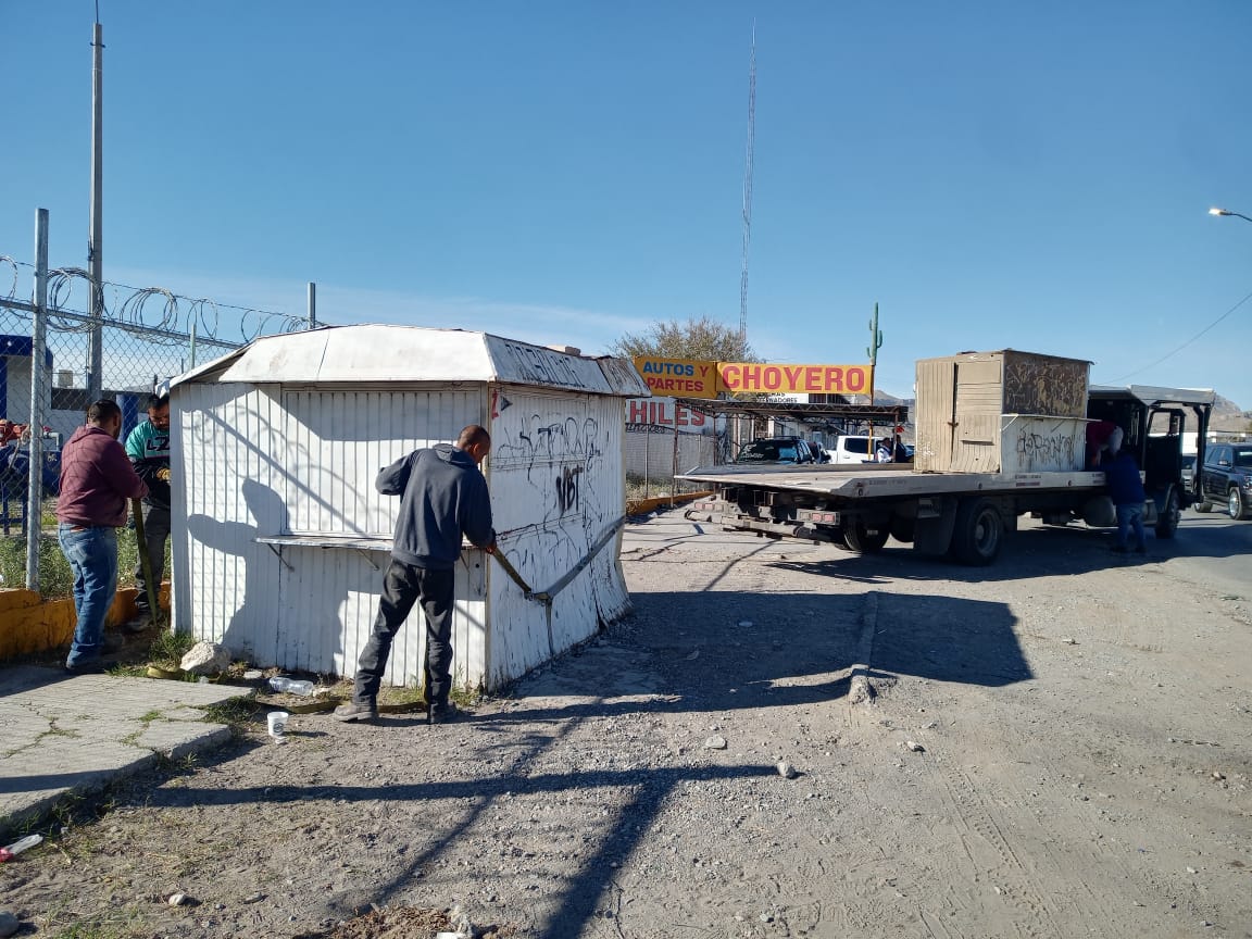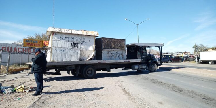 Ciudad Juárez, Chih.- Como parte del Operativo de Reordenamiento Urbano, empleados de diversas dependencias del Gobierno Municipal retiraron este jueves dos puestos de lámina en estado de abandono, ubicados en el cruce de la Perimetral Carlos Amaya y la calle Tzetzales.