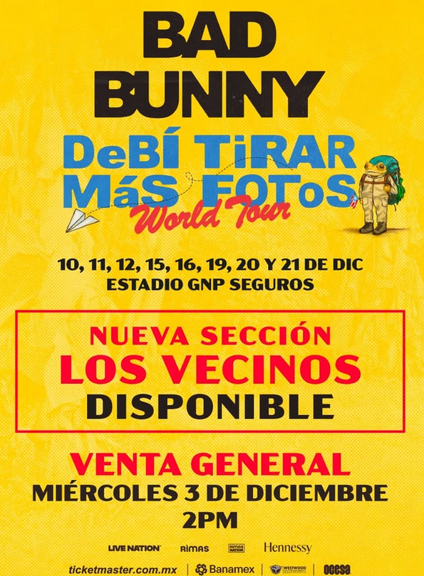 La venta de esta sección comenzará el miércoles 3 de diciembre a las 2:00 p.m., exclusivamente a través de Ticketmaster. Debido al furor generado por la gira del “Conejo Malo”, se prevé una alta demanda, por lo que se recomienda a los interesados estar listos con antelación.