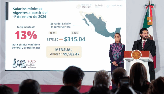 Ciudad de México.– A partir del 1 de enero de 2026, el salario mínimo general en México aumentará un 13%, en beneficio de más de 8.5 millones de personas trabajadoras, informó este jueves la presidenta Claudia Sheinbaum Pardo durante su conferencia matutina.