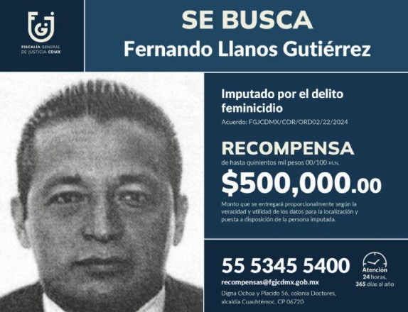 Ciudad de México.— La Fiscalía General de Justicia de la Ciudad de México (FGJCDMX) emitió una ficha de búsqueda y anunció una recompensa de hasta 500,000 pesos por información que permita la localización y captura de Fernando Llanos Gutiérrez, acusado del feminicidio de Carla Sacnité Peña Sánchez, originaria del estado de Hidalgo.