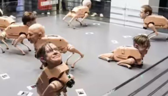 Los canes mecánicos con las cabezas de estos humanos deambulan por una especie de corral, donde caminan, parpadean, toman fotos del público y defecan impresiones fotográficas o NFTs, según el “perro” en cuestión.