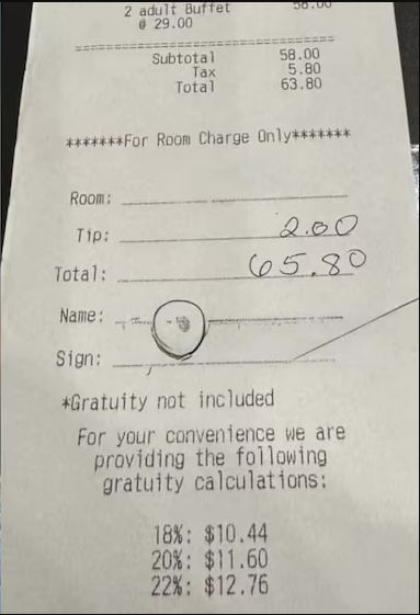 Lo que comenzó como una simple publicación en redes sociales terminó encendiendo un debate nacional sobre las propinas en establecimientos de autoservicio. Una pareja estadounidense, identificada como Andrian y Mirela, publicó en Facebook el recibo de un desayuno buffet que pagaron en Arlington, Texas, dejando únicamente dos dólares de propina sobre un consumo de casi 60 dólares.