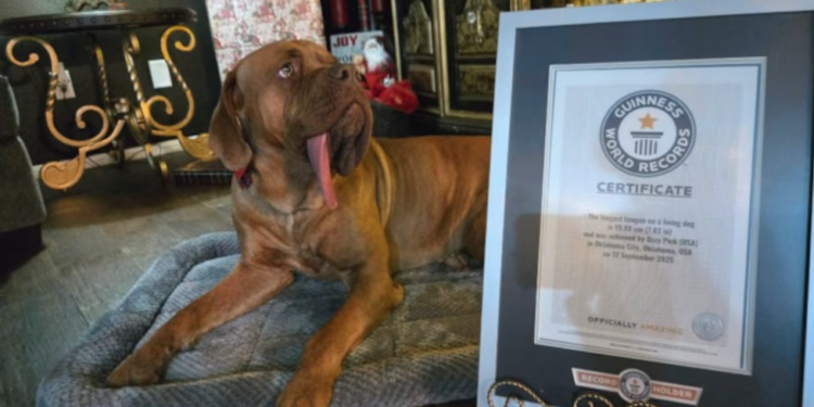 Ozzy, un perro mestizo de mastín francés y bullmastiff que vive con la familia Pick en Oklahoma City, ha sido oficialmente reconocido por Guinness World Records por tener la lengua más larga del mundo entre los perros: 19.89 centímetros, una cifra que asombró tanto a sus dueños como a la comunidad veterinaria local.