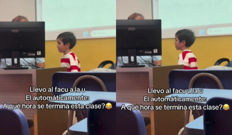 De acuerdo con el video que circula en redes como TikTok e Instagram, la joven madre llevó a su hijo a la universidad al no contar con quien lo cuidara durante el día. Durante la sesión, el menor se acercó con total naturalidad al escritorio del profesor y preguntó frente a todo el grupo: “Profesor, ¿a qué hora termina esta clase?”.