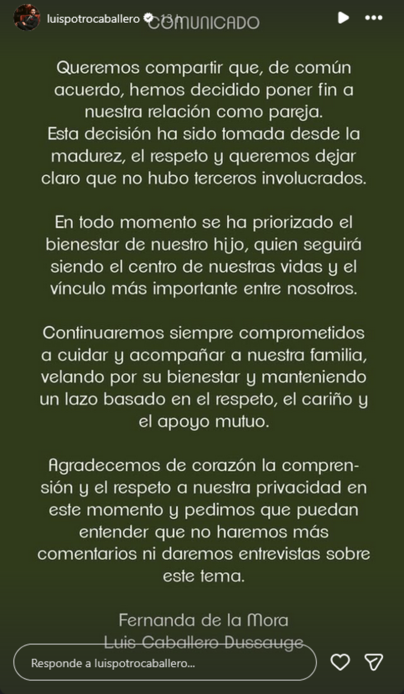Ciudad de México.— Luis “Potro” Caballero y Fernanda de la Mora confirmaron oficialmente el fin de su relación sentimental a través de un comunicado conjunto publicado en redes sociales, en el que explican que la decisión fue tomada de mutuo acuerdo, desde la madurez y el respeto.