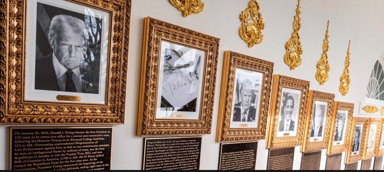 De acuerdo con reportes, Trump no solo modificó la tradicional galería de expresidentes que conduce a la Oficina Oval, sino que también instaló placas biográficas alteradas con afirmaciones ofensivas y teorías sin fundamento.