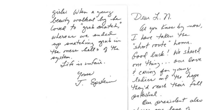 EE.UU.- Fotografía publicada por el Departamento de Justicia de Estados Unidos (DOJ) en el segundo lote de los archivos del caso del pederasta Jeffrey Epstein que muestra una carta supuestamente escrita por Epstein a su compañero el delincuente sexual ‘L.N.’ (Larry Nassar). Entre los nuevos archivos publicados por el Departamento de Justicia estadounidense sobre el caso del pederasta Epstein figura un testimonio captado por el FBI en el que se menciona a alguien que aseguró haber sido violada por el hoy presidente de Estados Unidos, Donald Trump.