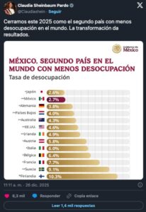 “Cerramos este 2025 como el segundo país con menos desocupación en el mundo. La transformación da resultados”, afirmó Sheinbaum Pardo, al vincular estas cifras con los avances impulsados por el proyecto de la llamada Cuarta Transformación.