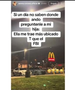 “Si un día no saben dónde ando, pregúntenle a mi hija, me trae más ubicada que el FBI”, escribió Coronel, haciendo referencia a la Federal Bureau of Investigation. La publicación estuvo acompañada de una imagen tomada en un estacionamiento, donde se observa un establecimiento de comida rápida, además de un emoji de risa.