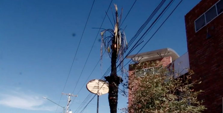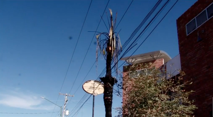 Ciudad Juárez, Chih.- Una palmera ubicada sobre el camellón del cruce entre la avenida Adolfo López Mateos y De la Raza fue consumida por las llamas, luego de que presuntamente se registrara un corto circuito en el cableado eléctrico cercano.