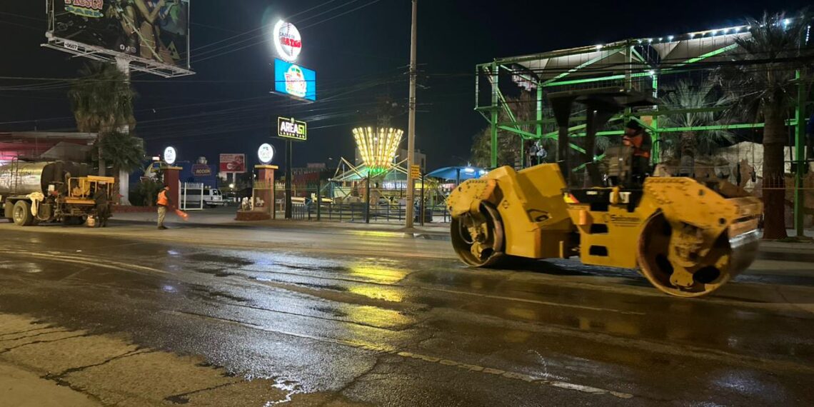 Ciudad Juárez.— Como parte del programa de Mejoramiento de Vialidades, la Dirección General de Obras Públicas emprendió trabajos de rehabilitación durante la noche en el crucero de las avenidas De la Raza y Tecnológico, específicamente bajo el Puente Rotario.