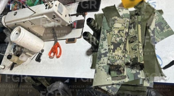 Entre lo decomisado también se encontró indumentaria con insignias de la Policía Estatal, un chaleco verde con café camuflado, un rollo de tela color café con verde y rojo camuflado, así como un tramo de tela bordado con el nombre de una institución de las Fuerzas Armadas de México.
