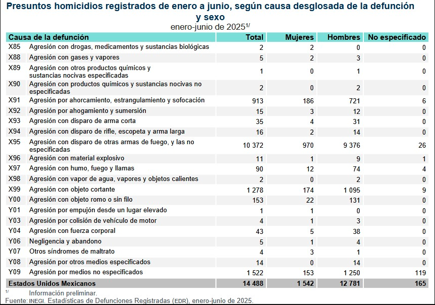 Ciudad de México.— El Instituto Nacional de Estadística y Geografía (INEGI) reportó que entre enero y junio de 2025 se registraron 14,488 presuntos homicidios en el país. Esta cifra preliminar representa una disminución frente a los 15,243 casos contabilizados en el mismo periodo de 2024.