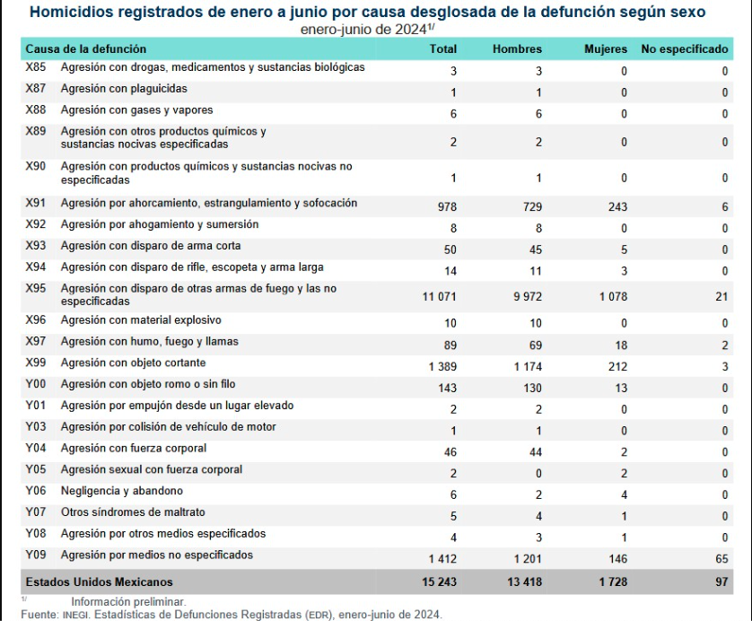 El informe del INEGI confirma que las armas de fuego siguen siendo el método más común para cometer homicidios en México. De los 14,488 casos registrados en el primer semestre de 2025, 10,423 fueron cometidos con arma de fuego, lo que representa el 71.9% del total.
