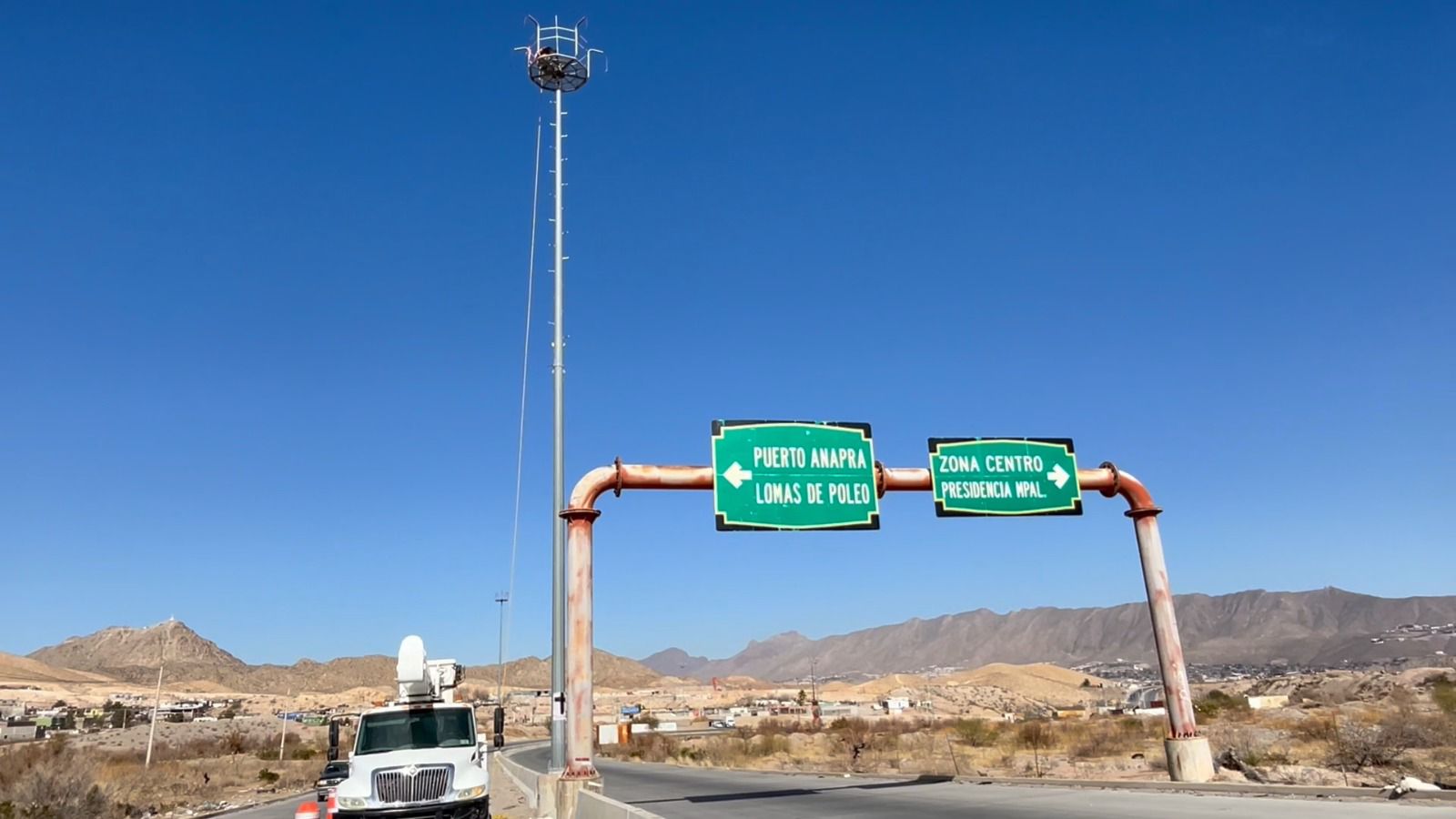 Los trabajos comprenden la intervención de un tramo de 7 kilómetros que va desde la calle Rancho Anapra hasta la salida del Mirador Hidalgo, donde se realiza la instalación de luminarias LED de alto montaje y la rehabilitación total del cableado eléctrico.