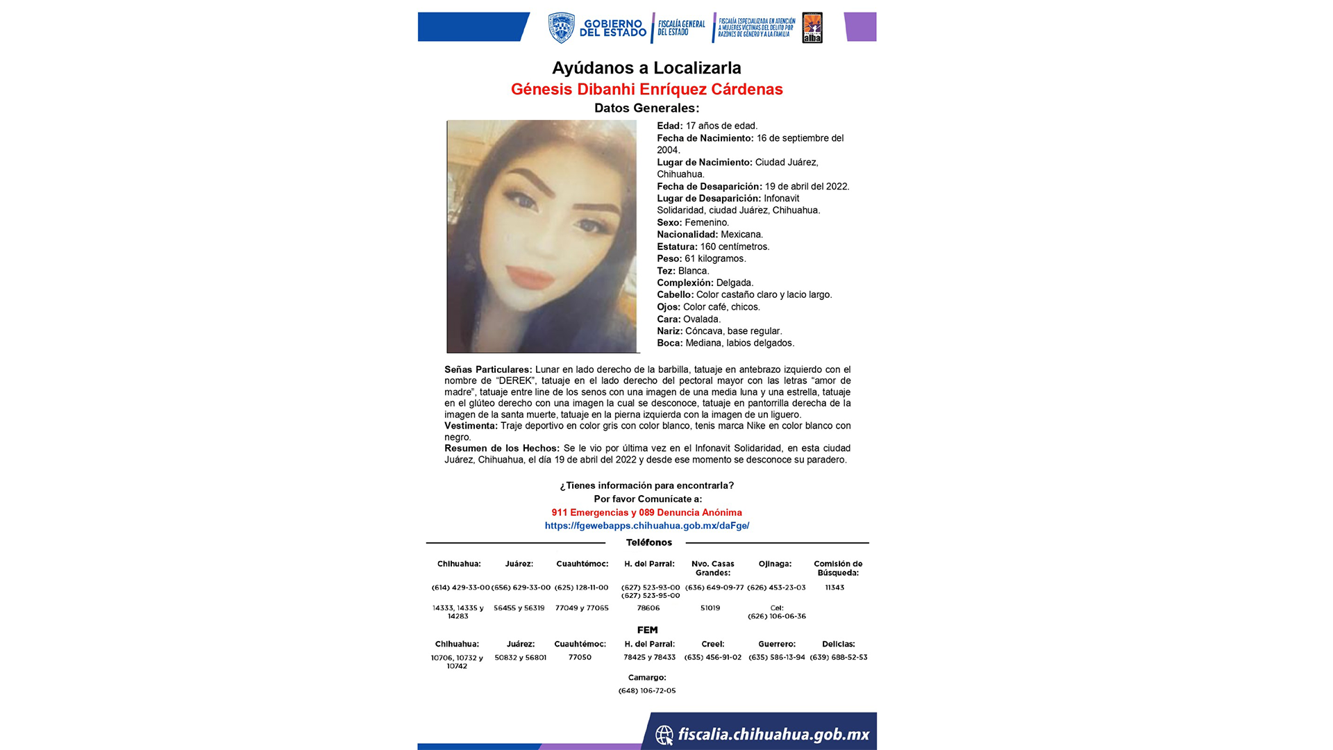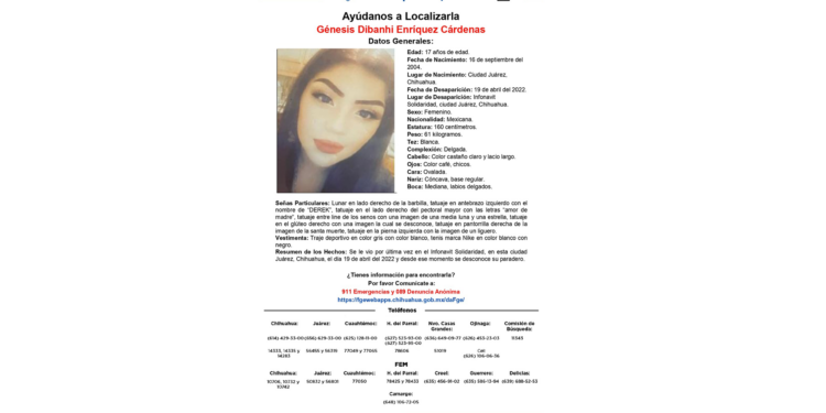 Continúa búsqueda de Génesis Dibanhi Enríquez Cárdenas en Ciudad Juárez
