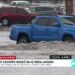 Camioneta varada tras caer en alcantarilla