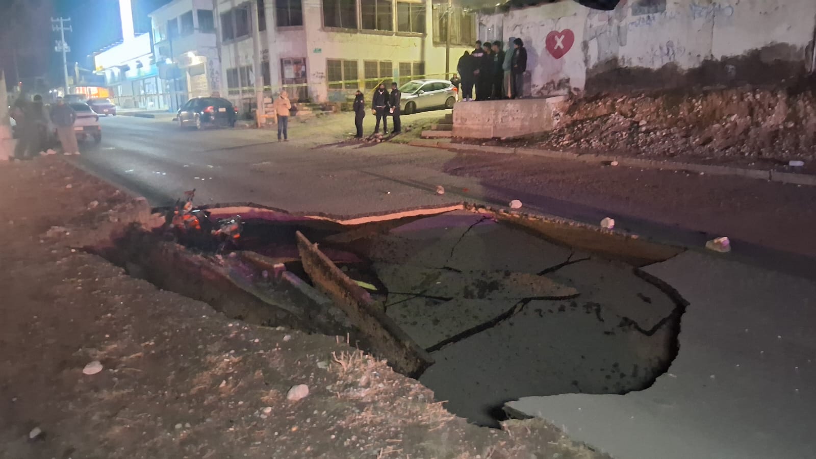 De acuerdo con testigos, el colapso del pavimento ocurrió justo al momento en que el conductor pasaba por la zona. La motocicleta terminó dentro del hoyo y el hombre quedó con diversas lesiones, por lo que fue atendido por paramédicos en el lugar.