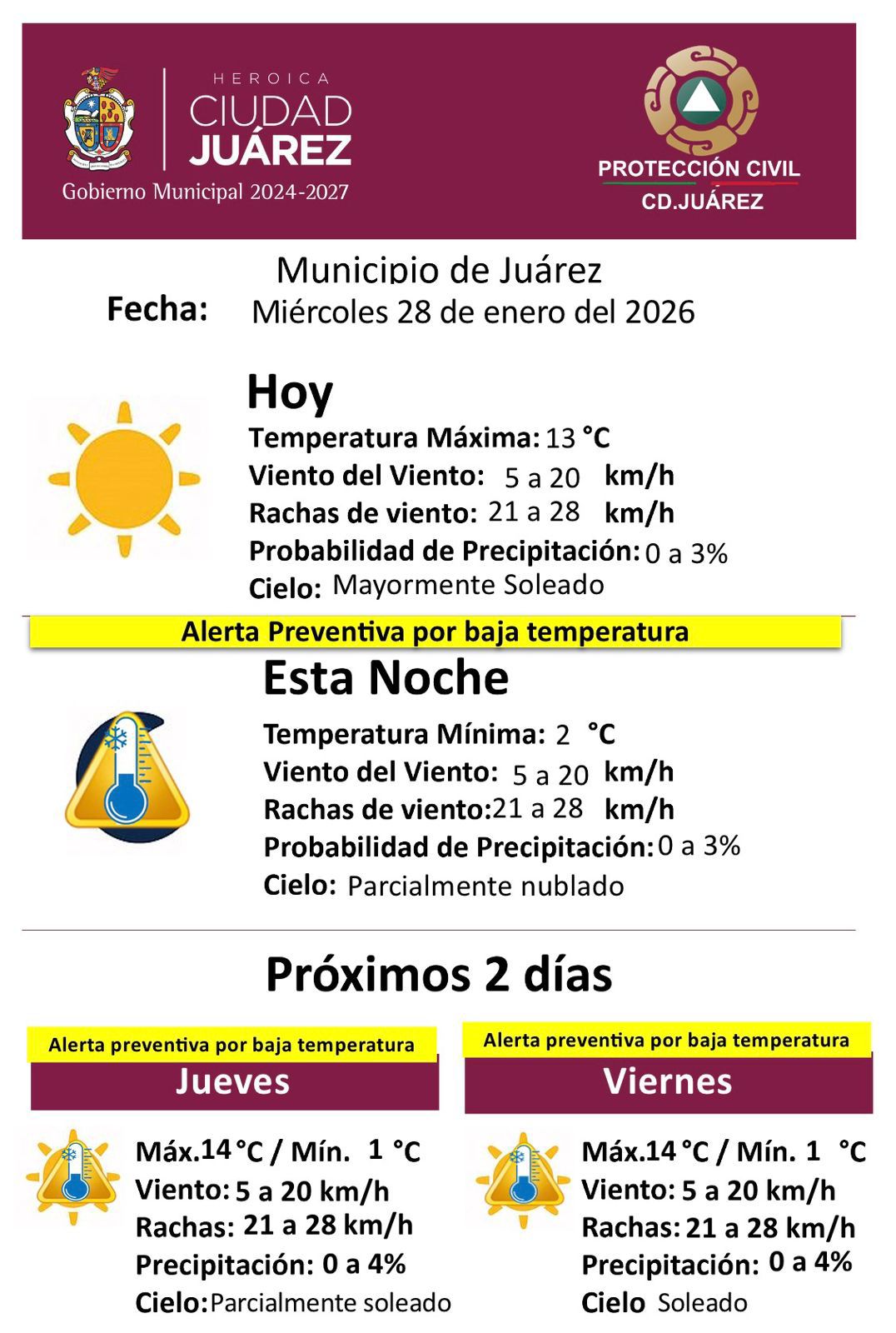 Ciudad Juárez, Chih. – La Dirección General de Protección Civil del Municipio emitió una alerta preventiva por bajas temperaturas que se mantendrá vigente a partir de este martes 27 de enero y durante los siguientes días, ante las condiciones climáticas frías que afectarán a la región.