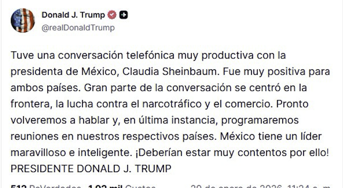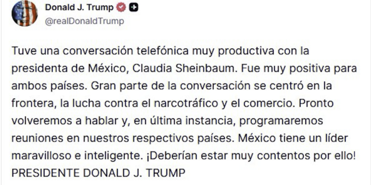 EE.UU.- El presidente de Estados Unidos, Donald Trump, mantuvo esta jueves una conversación telefónica “muy productiva” con la presidenta de México, Claudia Sheinbaum, sobre cuestiones fronterizas y relacionadas con el tráfico de drogas, según contó en la cuenta de su red social Truth.