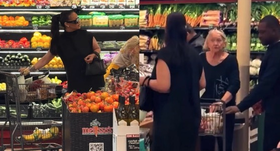 En las imágenes, la intérprete de Diamonds recorre los pasillos vestida de negro, acompañada por su equipo de seguridad y su chef personal, mientras elige productos como frutas y verduras.