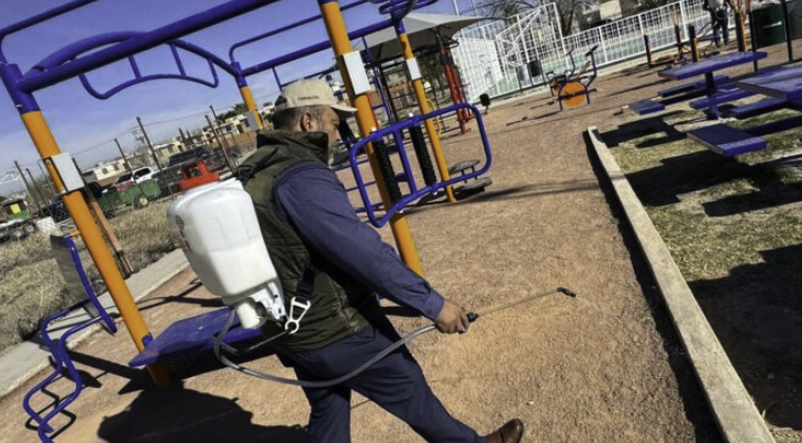 Autoridades municipales iniciaron una jornada de fumigación masiva en diversos parques del fraccionamiento Valle del Sol, como parte de las acciones preventivas para el control y erradicación de la garrapata en espacios públicos.