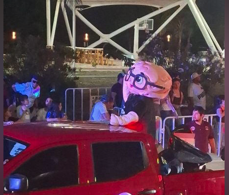 La botarga hacía referencia a Gerardo Sánchez Sansores, conocido como “SesoLoco”, quien ha manifestado públicamente su interés en contender por la gubernatura de Campeche en 2027. Aunque no ocupa un cargo formal en el gobierno estatal, se presenta como asesor político y ha sido visto acompañando a la mandataria en diversos eventos.