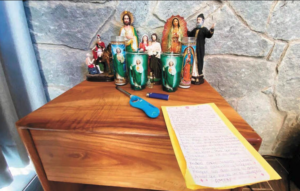 De acuerdo con un recorrido difundido por medios nacionales, en la vivienda se encontraron figuras de San Judas Tadeo, la Virgen de Guadalupe y San Charbel, además de un escrito con la frase: “Dígale al Señor: mi amparo, mi refugio, mi Dios, en quien yo pongo mi confianza”, correspondiente al Salmo 91.