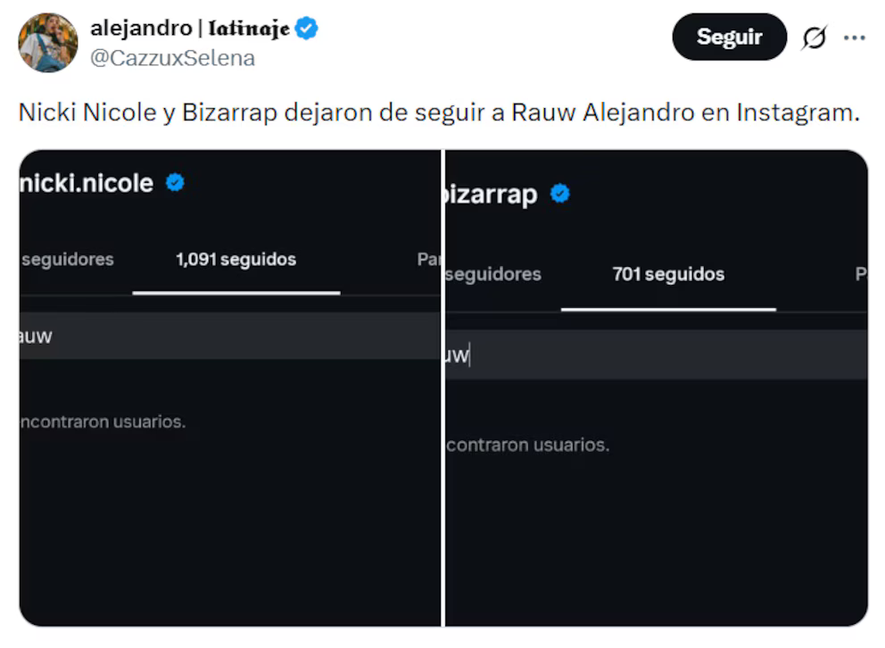 Además, comenzaron a circular capturas que indicarían que Nicki Nicole y Bizarrap dejaron de seguir a Rauw Alejandro en Instagram, y que Emilia Mernes habría hecho lo mismo con Jhayco, Rauw y Tainy. Aunque no hubo declaraciones oficiales, estos gestos digitales fueron interpretados como posicionamientos simbólicos dentro de la escena musical.