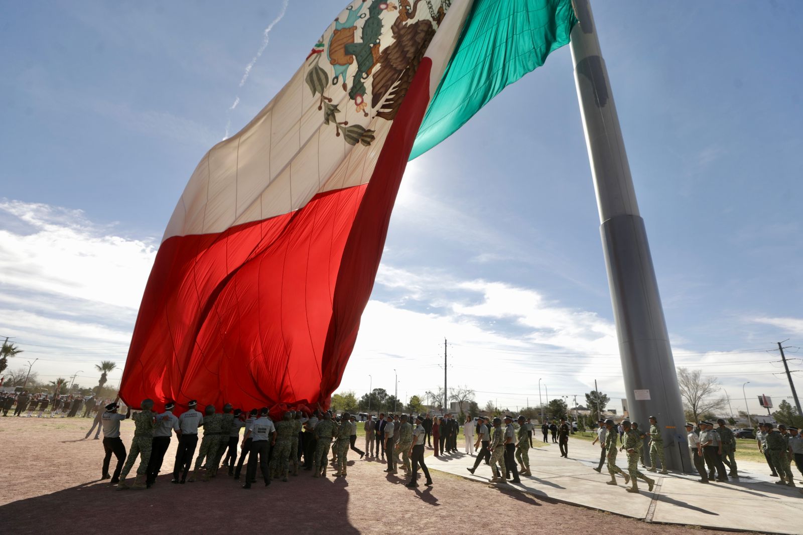 Ciudad Juárez, Chih.- En el marco del Día de la Bandera, el Presidente Municipal, Cruz Pérez Cuéllar, encabezó junto con autoridades de la Guarnición Militar una ceremonia solemne en la Plaza de la Megabandera, donde se realizó la incineración de banderas deterioradas y el abanderamiento de instituciones educativas.