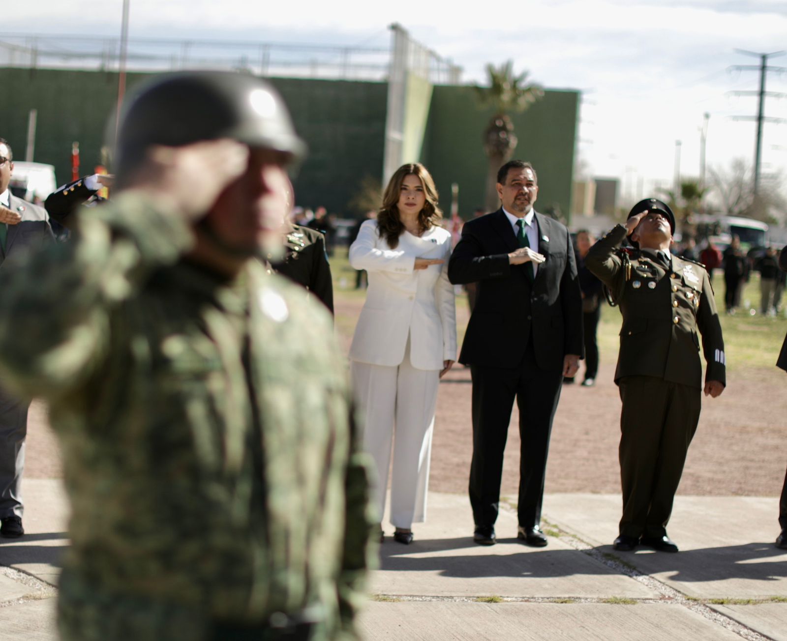 En el presídium estuvieron presentes representantes de la Guardia Nacional, del Noveno Regimiento de Caballería, autoridades educativas, municipales y de Protección Civil, quienes participaron en el acto cívico que reafirmó el compromiso de la frontera con el amor y respeto a México.