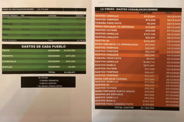 Uno de los cortes correspondientes a diciembre de 2025 señalaría ingresos superiores a 8 millones de pesos en esa región, mientras que los gastos operativos habrían superado 1.3 millones de pesos en el mismo periodo, según las cifras difundidas.
