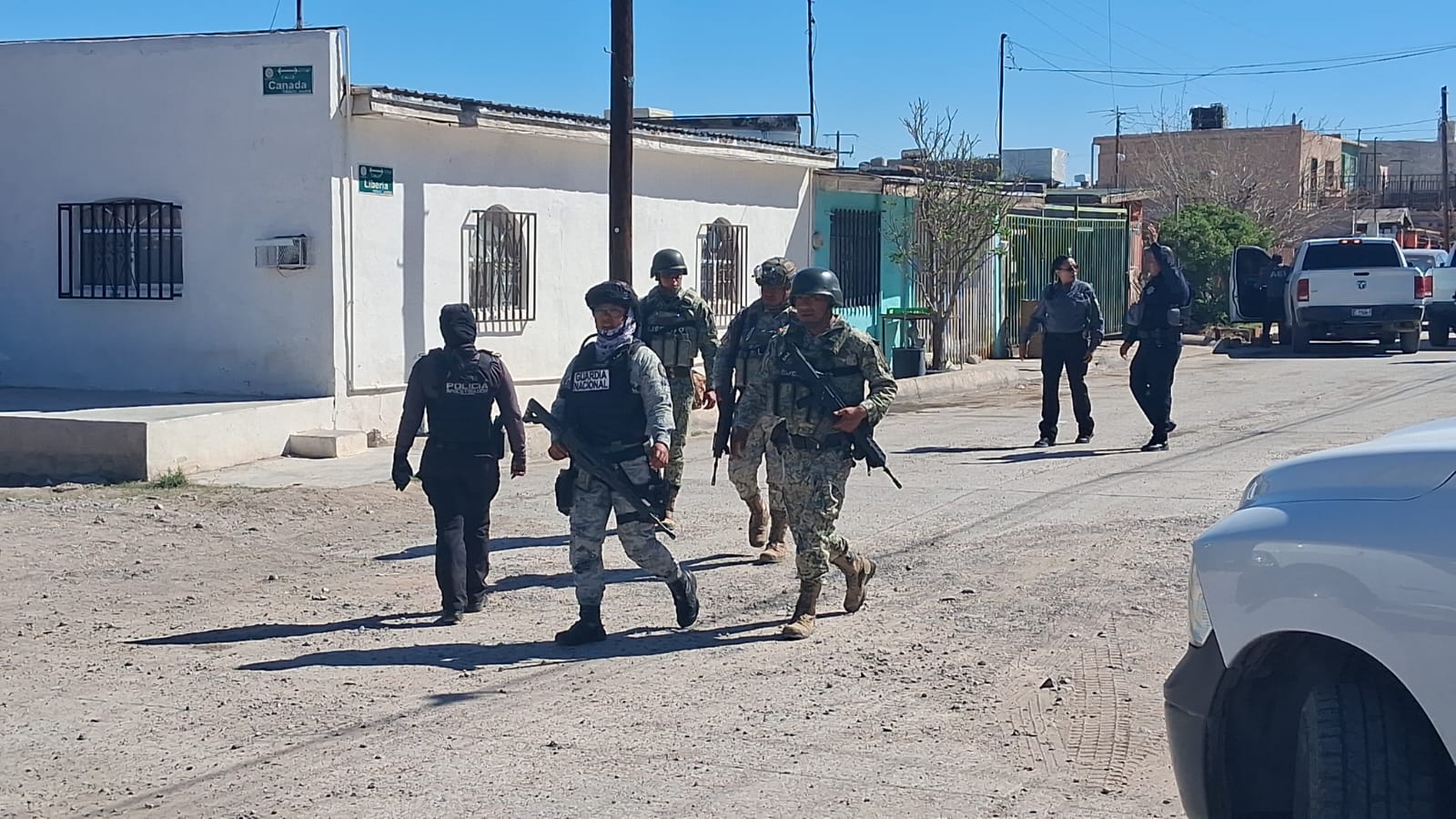 Ciudad Juárez, Chih.- Un operativo de cateo realizado por autoridades en el fraccionamiento Oasis derivó en la detención de dos personas y el aseguramiento de dos vehículos, en un domicilio ubicado en el cruce de las calles Liberia y Canadá.