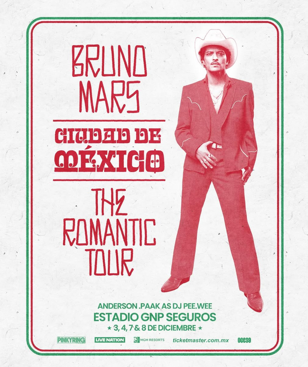 Ciudad de México.- El cantante estadounidense Bruno Mars confirmó su regreso a México con una serie de conciertos en la Ciudad de México, lo que rápidamente generó entusiasmo entre sus seguidores en el país. El artista incluirá a la capital mexicana dentro de su gira mundial “The Romantic Tour”, con varias presentaciones programadas para finales de 2026.