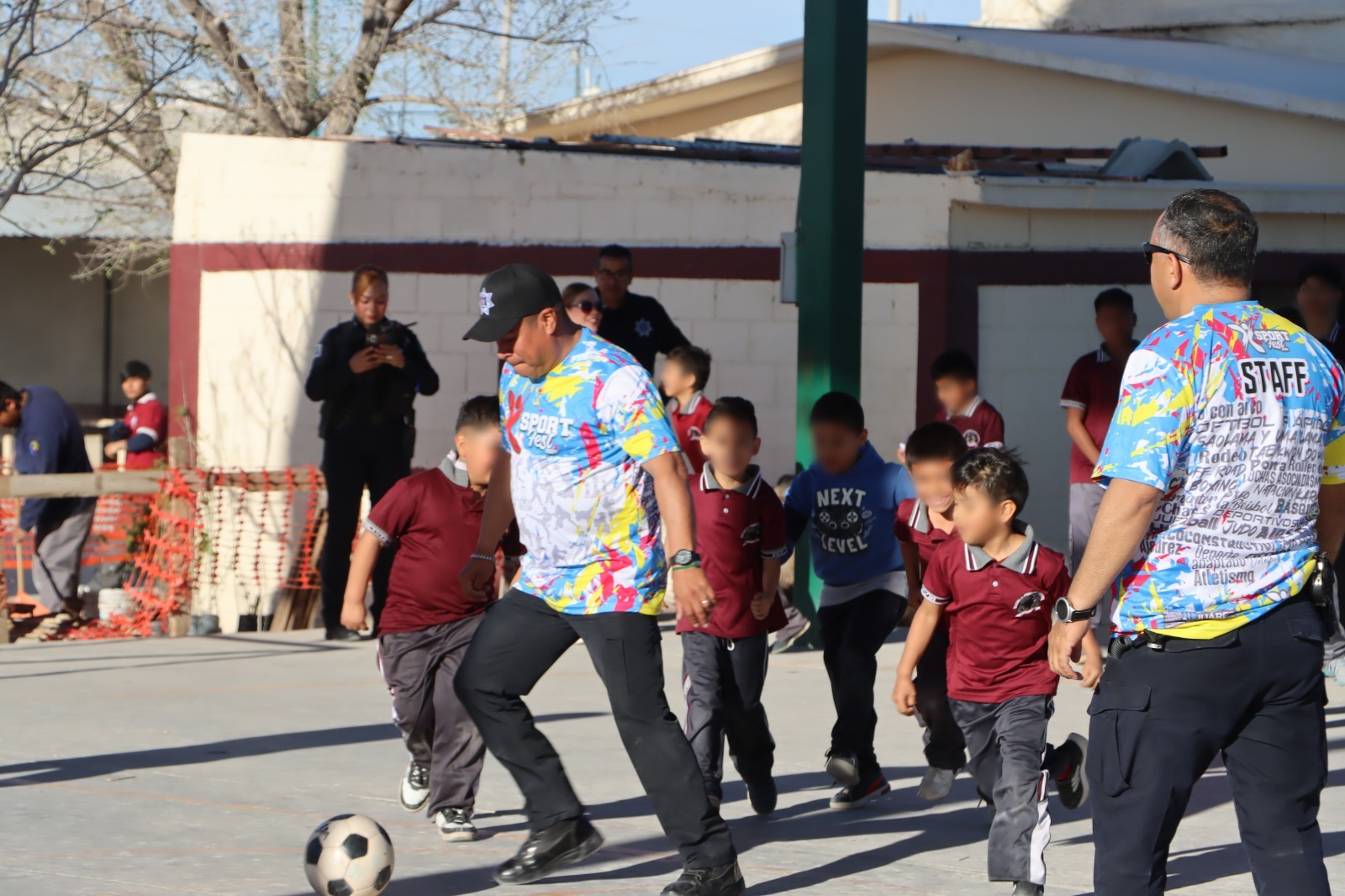 Durante la visita, los agentes organizaron un partido de fútbol soccer en el que participaron alumnos y personal docente del plantel, quienes recibieron con entusiasmo a los oficiales y demostraron sus habilidades en la cancha.