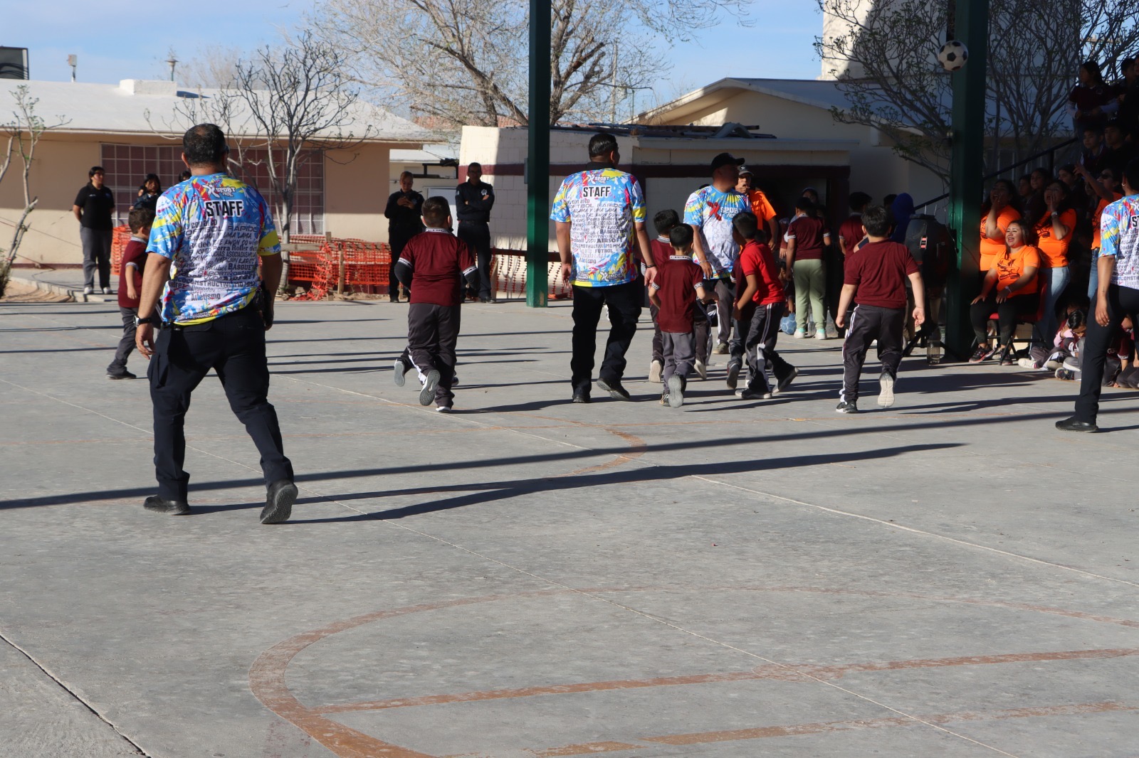 Ciudad Juárez, Chih.– Como parte de las acciones para fomentar entornos escolares libres de violencia, elementos de la Secretaría de Seguridad Pública Municipal (SSPM), adscritos a la Dirección de Prevención Social, acudieron a la escuela primaria “República de Bolivia” para convivir con estudiantes y docentes a través de actividades deportivas.