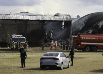 México.- Integrantes de Protección Civil, el ejército mexicano y del cuerpo de bomberos trabajan en la bodega industrial donde cayó ...