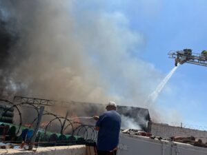 Ciudad Juárez.– Un incendio registrado la tarde de este viernes en la colonia El Granjero generó una amplia movilización de cuerpos de emergencia, luego de que una bodega ubicada en el cruce de las calles Sandía y Melón fuera consumida por las llamas.