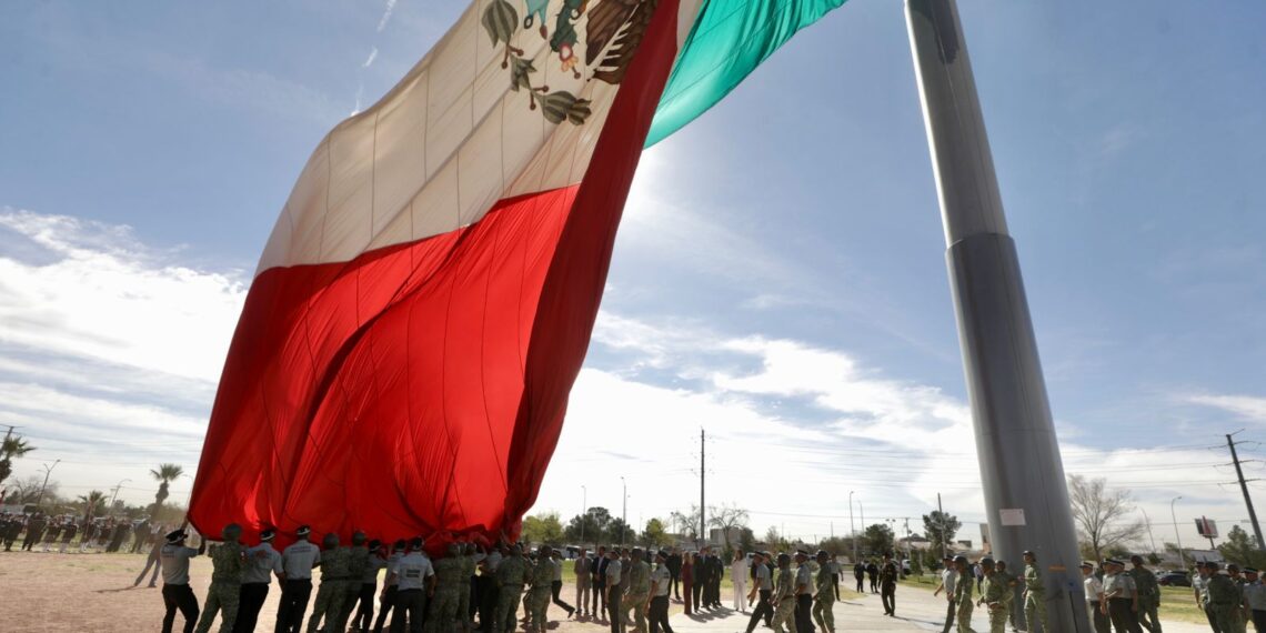 Ciudad Juárez, Chih.- En el marco del Día de la Bandera, el Presidente Municipal, Cruz Pérez Cuéllar, encabezó junto con autoridades de la Guarnición Militar una ceremonia solemne en la Plaza de la Megabandera, donde se realizó la incineración de banderas deterioradas y el abanderamiento de instituciones educativas.