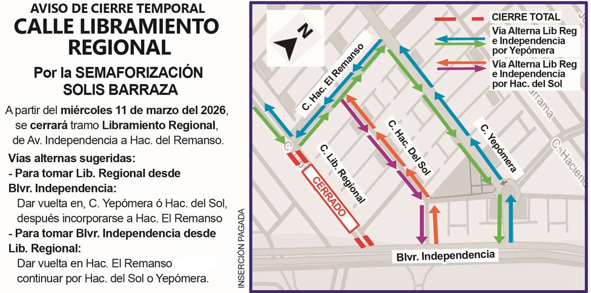 Ante estas labores, se recomendó a los automovilistas utilizar vías alternas para evitar congestionamientos en la zona. Para quienes circulen desde el bulevar Independencia con destino al Libramiento Regional, se sugiere tomar la calle Yepómera o Hacienda del Sol y posteriormente incorporarse a Hacienda del Remanso.