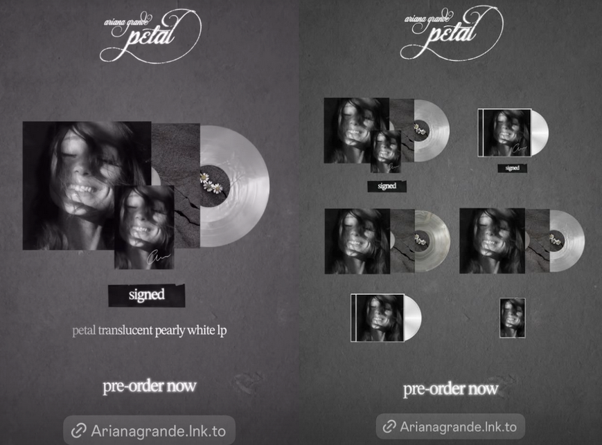 Petal será el primer álbum de estudio completo de Ariana desde Eternal Sunshine, lanzado en marzo de 2024, junto con su edición deluxe Brighter Days Ahead. Con este nuevo lanzamiento, la artista suma ocho discos de estudio en su carrera, iniciada en 2013 con Yours Truly. Entre sus trabajos más destacados se encuentran My Everything, Dangerous Woman, Sweetener, Thank U, Next y Positions, consolidándola como una de las figuras más importantes del pop actual.
