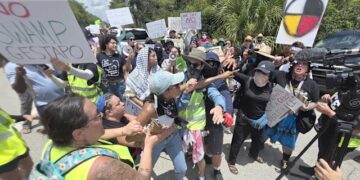 EE.UU. Protestas reciben a Trump durante su visita al centro Alcatraz para migrantes en Florida julio 1, 2025